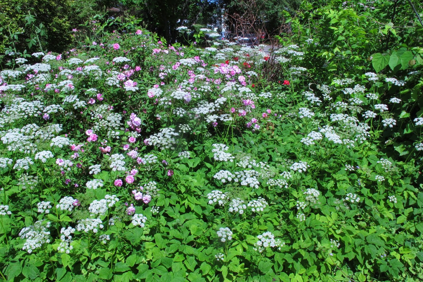 I love how she interplants wildflowers with her roses, the light, sweet Queen Anne's Lace then later will come the indigo bluebells. This corner of her yard is wild and free to fullness of color from the flowers. They look as if they just happened to land there as a surprise show where someone forgot to mow. It takes artistry to get that to happen. And she has the knack.